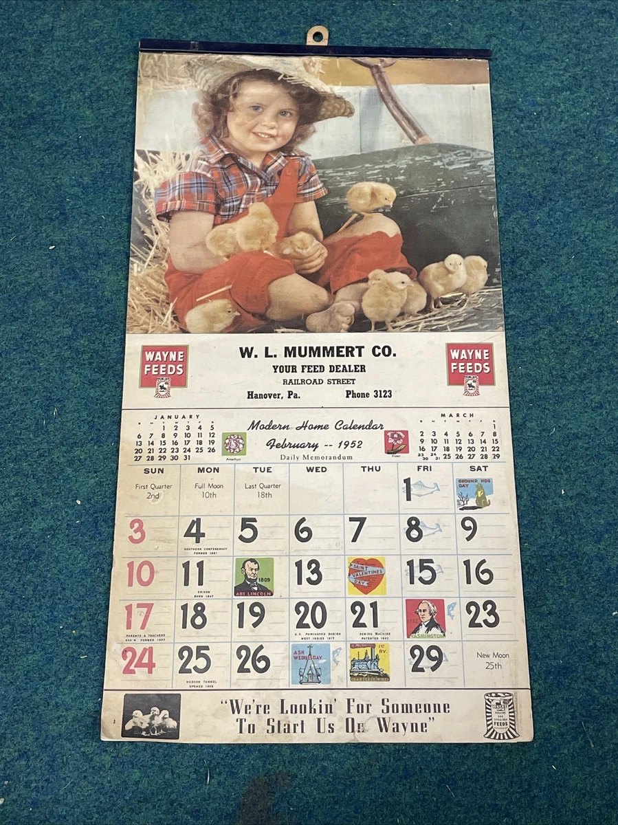 1952 Wayne Feeds W.L Mummert & Co. Advertising Calendar Hanover